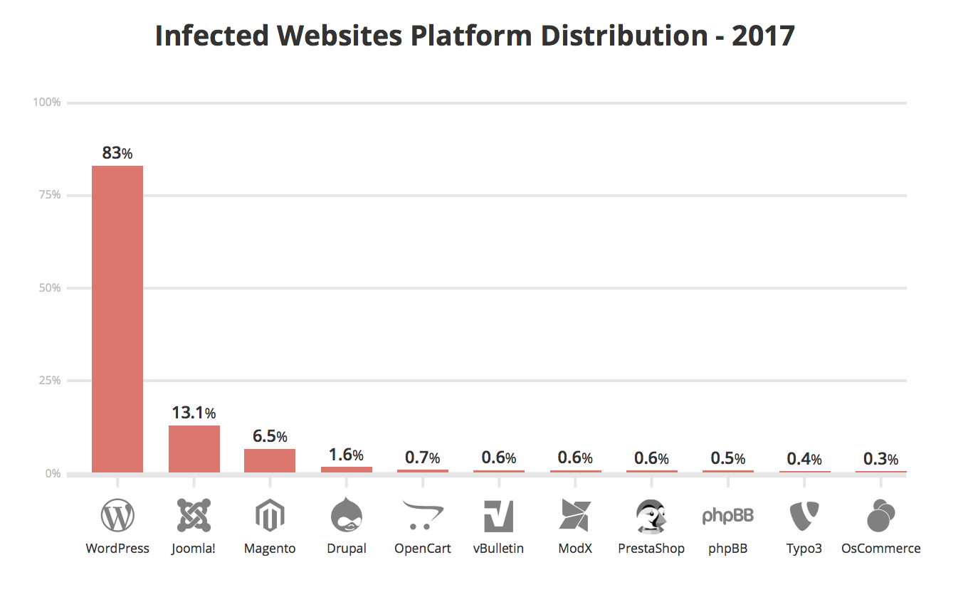 Of the 34,371 infected websites taken into account, 83% were WordPress with the next closest platform being Joomla at 13.1%.